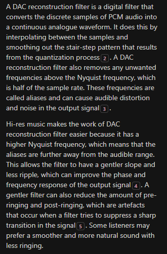 Το πλεονεκτημα του hi res ειναι να κανει ευκολοτερη τη δουλεια στο reconstruction filter του dac.Οι οποίες διαφορές μεταξύ και των δύο σε σχέση με το "ταπεινό" 16/44.1 μπορούν να ακουστούν μόνο απο νυχτερίδες, σε καταστάσεις θορύβου περιβάλλοντος που δεν συναντώνται πουθενά στο σύμπαν ( οκ, υπάρχουν και οι ανηχοϊκοί θάλαμοι, αλλά και πάλι θα ακούμε το χτύπο της καρδιάς μας ) και σε εντάσεις που ούτε τα αυτιά μας αντέχουν, ούτε τα ηχοσυστήματά μας μπορούν να αναπαράξουν.