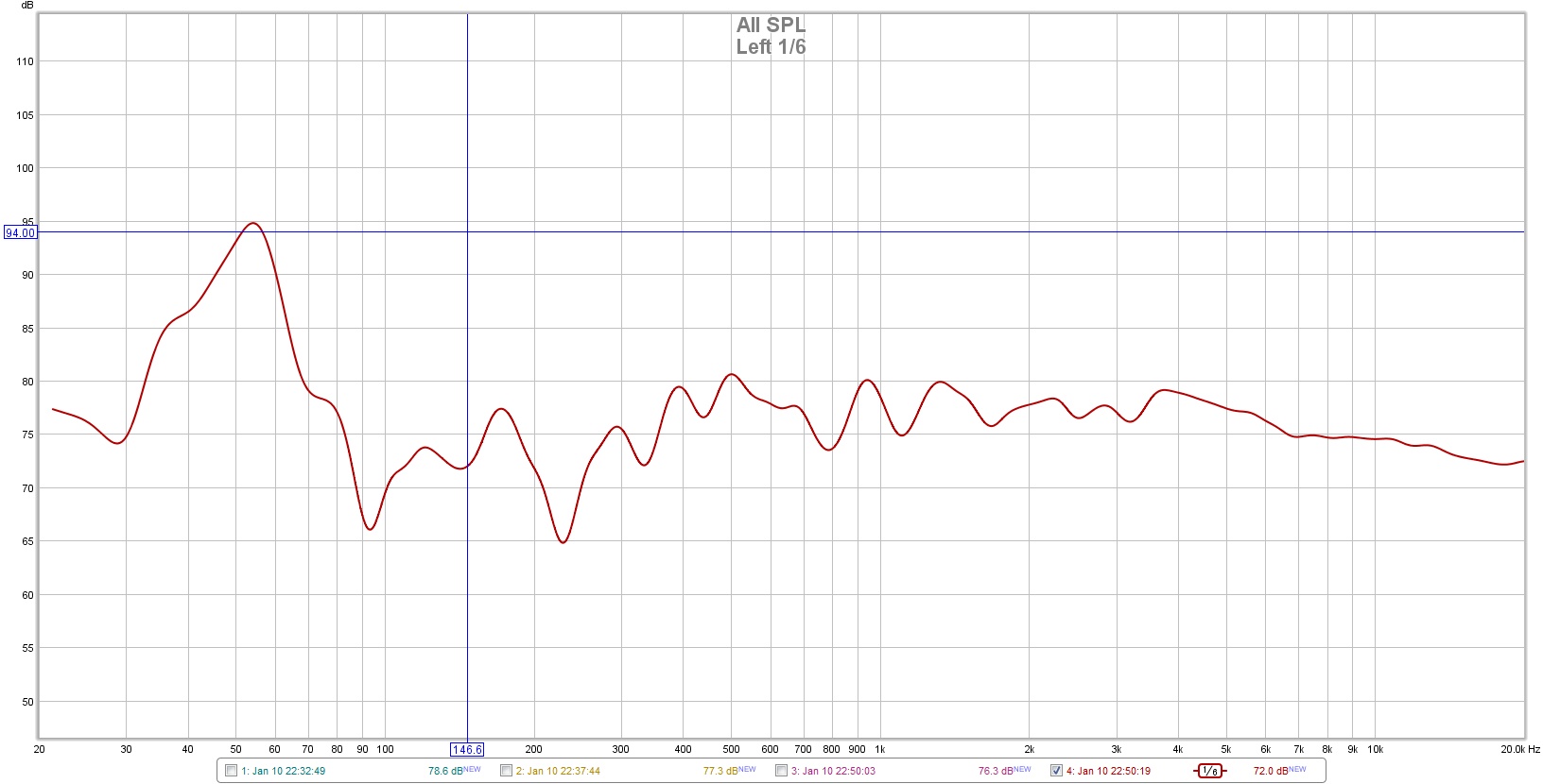 Εκανα και γω τις πρωτες μετρησεις με Dayton Omnimic v2 και οριστε τα αποτελεσματα.Ο χωρος ειναι μικρο δωματιο που προσεγγιζει το εσχατο 3χ3χ3 (ειναι περιπου 3.4χ3.6χ2.7) και τα επιπλα δεδομενου του χωρου ειναι πολλα (2 βιβλιοθηκες,ραφια,γραφειο,κρεβατι,μοκετα).Οποτε δεν υπαρχουν πολλα περιθωρια στις θεσεις των ηχειων.Επισης το αριστερο ηχειο ειναι σε γωνια και κοντα στην μπαλκονοπορτα εξου και ο τονισμος στους 50.Ελπιζω οι μετρησεις να ειναι σωστες.