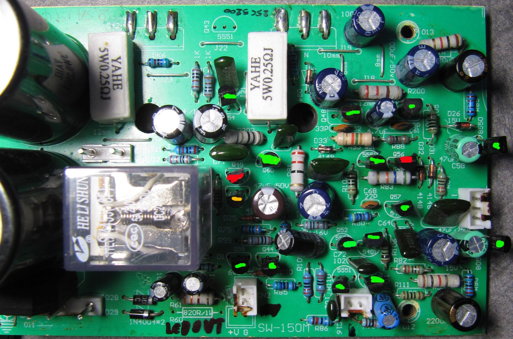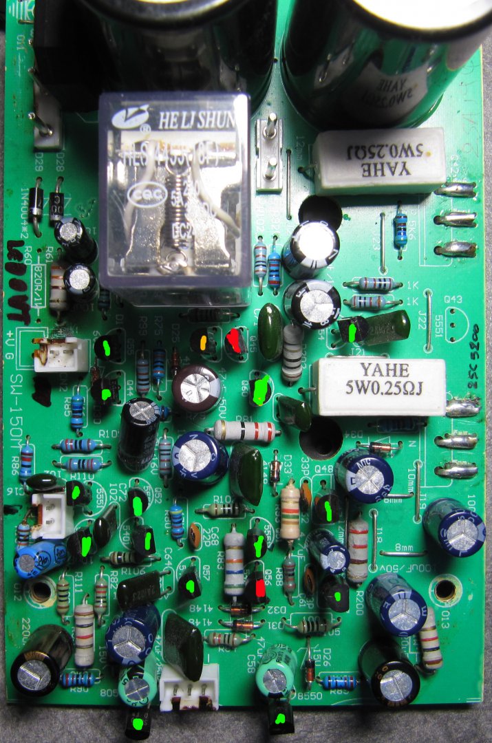 Έκατσα και έλεγξα με πολύμετρο και ειδικό εργαλείο ελέγχου πυκνωτών όλα τα εξαρτήματα και βρήκα 2 καμμένα (με κόκκινο βαμμένα στη φωτο) και ένα με τιμές που ήταν στο όριο (κίτρινο χρώμα). Τα άλλαξα και τα 3 και το sub δουλεύει!!!