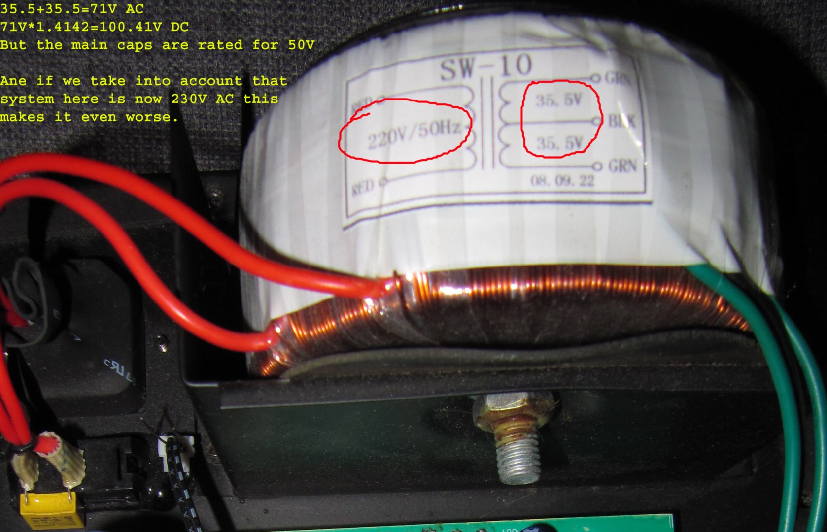 Οι 2 μεγάλοι πυκνωτές είναι 50V ο καθένας και ο μετασχηματιστής βγάζει 35.5V AC , 0 -35.5V AC όπως φαίνεται στην εικόνα. Άρα μετά την ανόρθωση παίρνουμε περίπου 100.4V DC τα οποία μοιραζονται στους 2 πυκνωτές των 50V. Με λίγα λόγια όχι απλά είμαστε στο όριο αλλά ελαφρά εκτός ορίου.