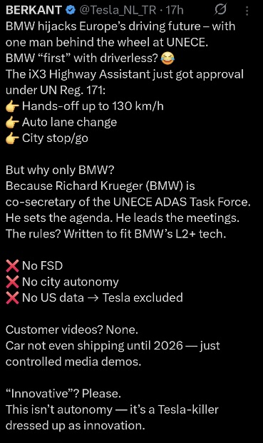 Από την άλλη, η BMW με την iX3 έγινε η πρώτη εταιρεία στην Ευρώπη με άδεια στον νέο κανονισμό ADAS της UNECE για τους αυτοκινητόδρομους (UN Reg. 171). Έχω γράψει για αυτά παλαιότερα. Ο νέος κανονισμός βγήκε τέλος 2024. Κάποιοι που τα ψάχνουν περισσότερο βλέπουν πως ματσάρει άψογα με τις δυνατότητες της iX3, και εκεί αρχίζουν να δημιουργούνται ερωτήματα. Πότε πρόλαβε και τέτοια.