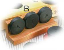 B1. Spatial Control Kit: The Spatial Control Kit consists of nine Mpingo Discs, six of which are mounted (three each) on two L-shaped holders. First the two holders were placed on the floor next to the speakers. Then one disc each on top of each speaker and the remaining disc in the center on the rear wall. By fine adjustments of these components you can fine tune the width, depth and centering of the sound stage. The disc on top of each speaker can also tweak the tonal balance of the music.
