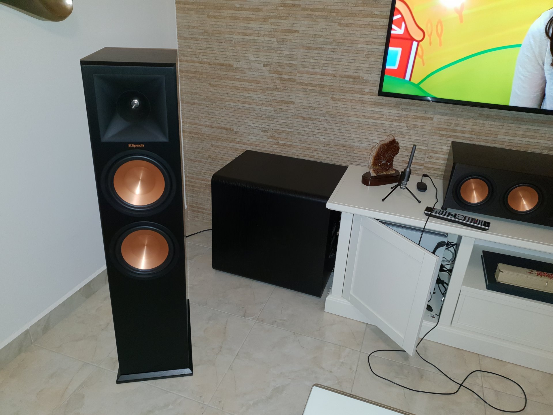 Κρίμα.Με τίποτα μες στη μεση είναι. Και είναι στο 1.50 από υη θέση ακρόασης. Και από τη δεξιά πκευρά θα κολισει στο καναπέ που είναι γωνιακός.
